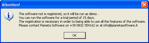 All the times the program is launched, the registration status is checked; If the software is not register yet, you will see the following message: